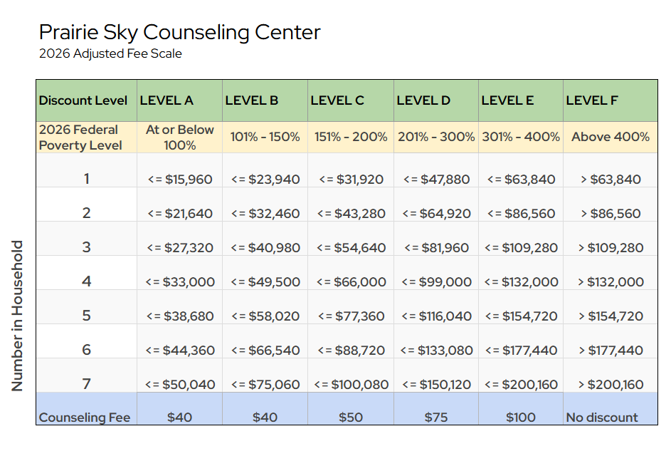 At Prairie Sky Counseling Center, we believe that mental health care should be accessible, transparent, and fair. Our payment policies are designed to support our clients while also ensuring that our nonprofit clinic can continue to serve the community.